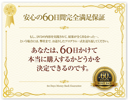 つまり、このDVDをご覧になって、内容に満足できなかったら、60日以内(必着)であればお支払いいただいた代金は『全額返金』いたします。