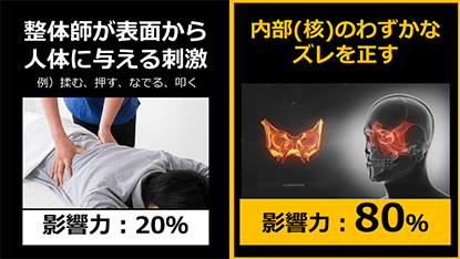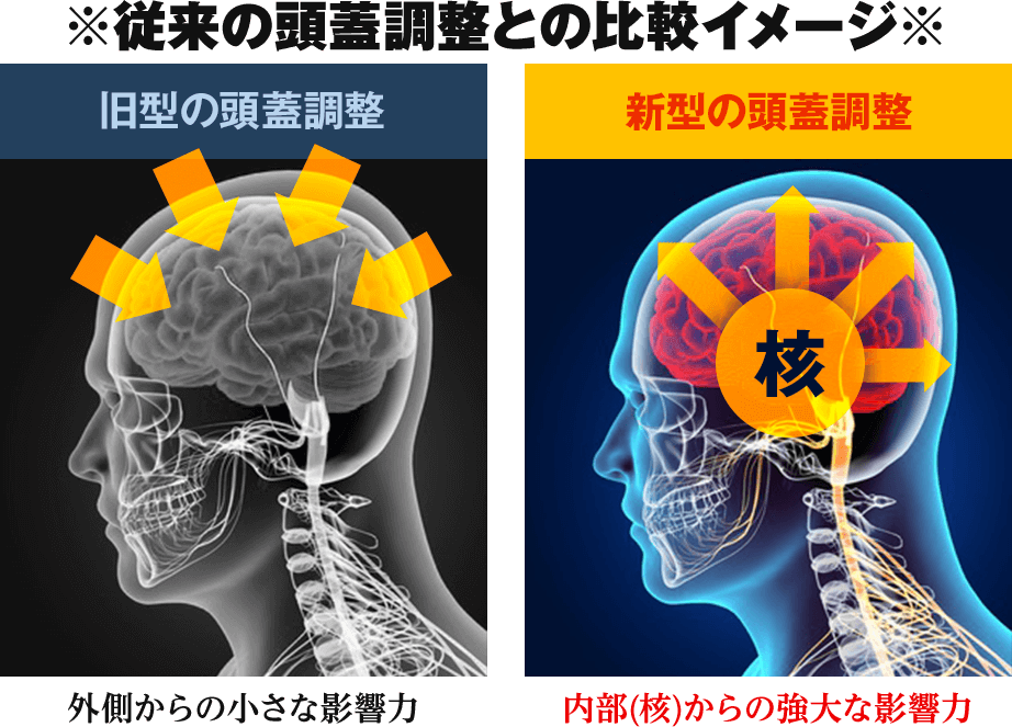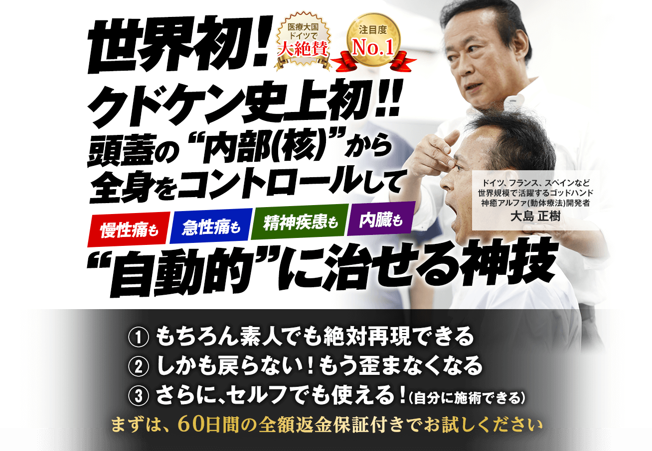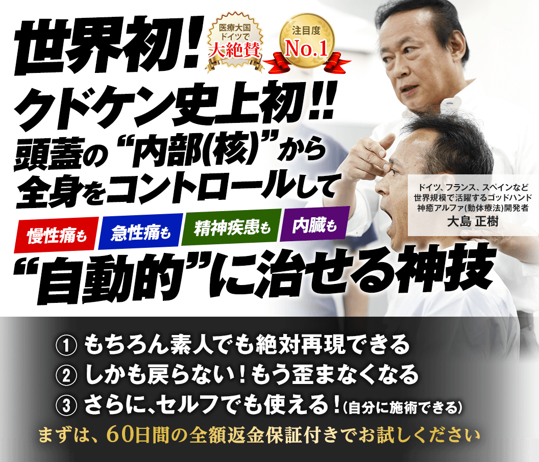 でも、実際は決して触れることはできない頭蓋の核を、まるで脳を直接触っているかのように調整出来るのが、あなたにご紹介させていただいたこの治療法「神癒アルファ」なんです。ホルモンバランスや神経系、内臓機能や精神疾患まですべてコントロールして全身をドミノ式に正常化できる規格外の治療法になります。