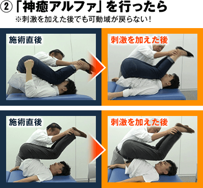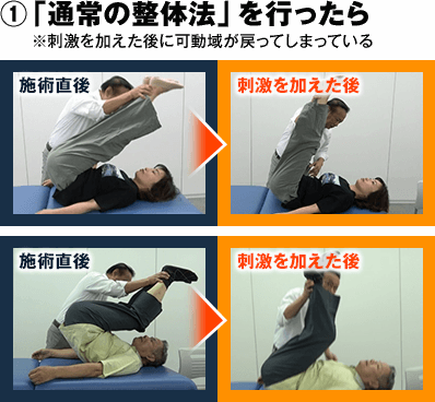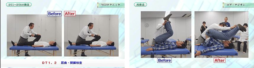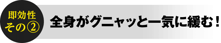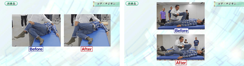 深部の筋肉から脊柱まで一気にユルユルになり、瞬時に軽くなります。ご覧の通り、ガチガチに固まっていた体幹がものの30秒でグニャ~ッと曲がってしまうのです。基本的には百発百中でこのような結果が出るので、上手く使えば施術開始直後から患者さんをビックリさせられます。