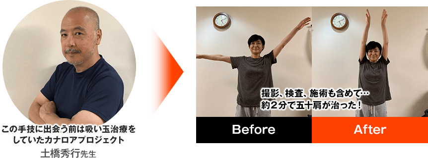 五十肩の患者さんに施術をしたところ撮影、検査を含め約2分で痛みが消えました。その後2週間が立ちましたが痛みの再発はなく腕の上がり方も施術直後と同じくらい上がります。あまりに簡単で効果があるので、他の先生にはすすめずに自分で独占したいというのが本音です。