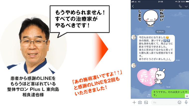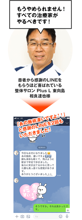 ある方は、身体が軽くなったと言って店を出て駅に着くまでの間に効果の大きさに「今日もお世話になりまた️^^あの施術、凄いですよ!脚も身体も軽くて、飛ぶように駅まで早足で歩きました。後ろに突き出てるかなと思ってた腰も真っ直ぐな感覚があります。ありうございました_(..)_ 」と感謝のLINEをいただき、その1週間後には「先日の施術は、とっても効果大です。歩くのも駅の階段も楽々です。ありがとうございます。またよろしくお願いいたします。」と2回ラインで喜びの声を頂きました。