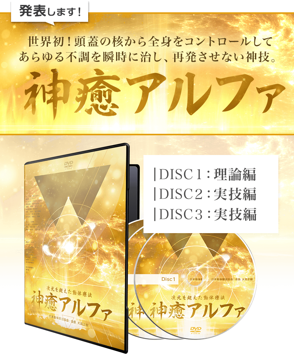 今回発表した「~次元を超えた動体療法~ 神癒アルファ」は世界で始めて頭に触れるだけで、頭蓋の内部/(核)にアプローチし全身の痛みや不調、ストレスをなかったことにできる方法が収録された唯一のDVDです。